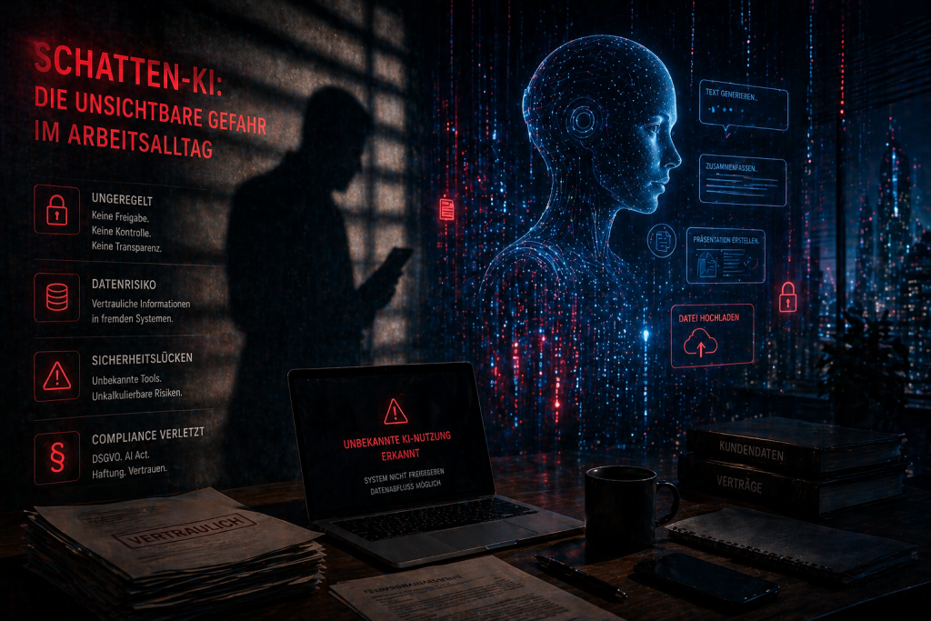 Künstliche Intelligenz ist längst kein Zukunftsthema mehr. Sie schreibt E-Mails, fasst Dokumente zusammen, erstellt Präsentationen und hilft bei Recherchen in Sekunden. Genau darin liegt aber auch das Problem: Je einfacher KI-Tools zugänglich sind, desto häufiger werden sie genutzt, ohne dass Unternehmen, Behörden oder Organisationen davon überhaupt wissen. Willkommen in der Welt der Schatten-KI, dem digitalen Kollegen, der heimlich mitarbeitet, aber weder kontrolliert noch sauber eingebunden ist. Gerade aus Datenschutz-, Compliance- und IT-Sicherheitsperspektive ist das kein kleiner Ausrutscher, sondern ein ernstzunehmendes Risiko.